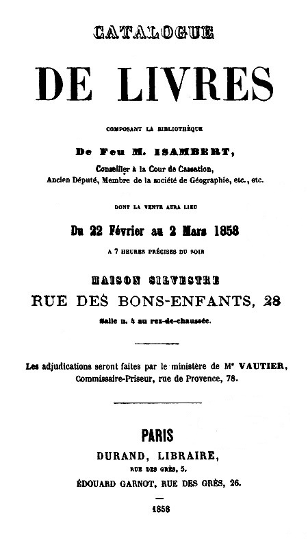 composant le cabinet de feu M. Isambert (Paris, Renou et Maulde, 1858,